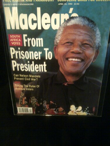 I snapped a photo of the cover Maclean’s Magazine from April 1994. It was on display at a Canadian War Museum museum in Ottawa, Ontario. It was an exhibit with several magazine covers over the last century. The title “From prisoner to President” really struck a chord. How profound. Nelson Mandela, the man who was imprisoned for over half his life at the time, became the President of the same country that took away his freedom. When anyone thinks about that experience it makes a person realize that anything is possible.