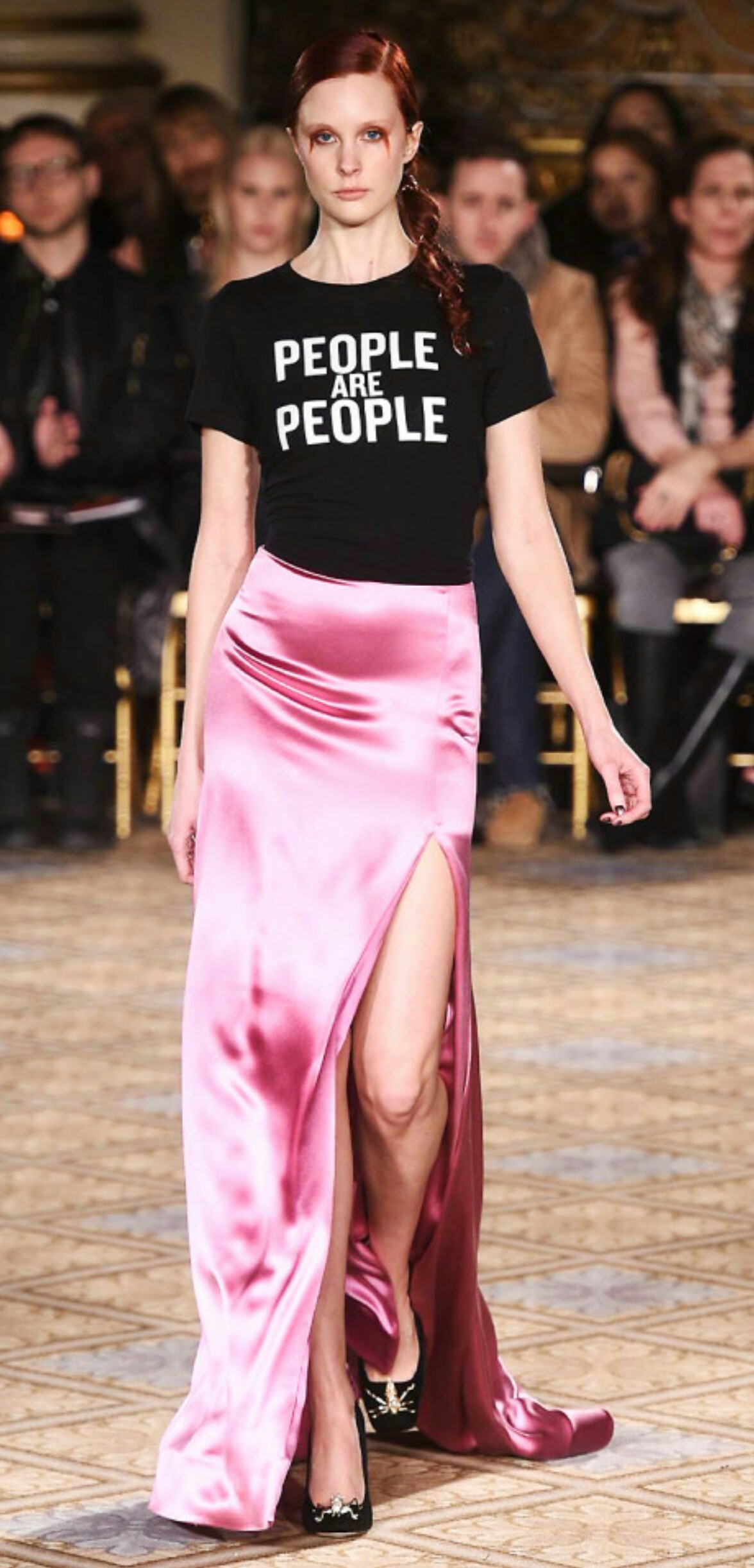 Wek was the first of the many models in the show who represented fashion’s new breed of models that represent the spectrum of beauty. In a political time when the U.S. is experiencing what seems like the clock turning back tk an era where inclusion was always a problem, Siriano made a statement with a t-shirt that said ‘People are people‘ worn with a long pink skirt.