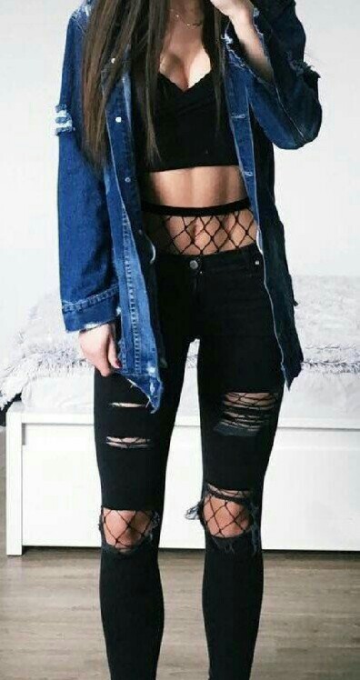 Grab your favourite pair of ripped jeans and wear them over your fishnet stockings. This is one of the coolest ways to wear them. Go the extra mile by finding a pair with added lace or jewel details to really make a statement with this look.
