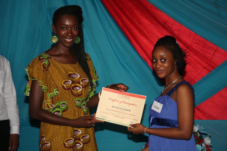 Giving a certificate of completion to a student at the Emerge Leadership Weekend in Accra, Ghana.